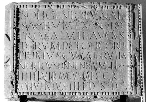 - Soli Genio Lunae / sacrum ex voto / pro salute Augus/torum P(ublius) Clod(ius) Corn(elia) / Primus curator vika/nor(um) Lousonnensium II / IIIIIIvir Augustal(is) c(urator) c(ivium) R(omanorum) / conventus Hel(vetici) d(e) s(uo) d(edit)