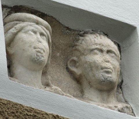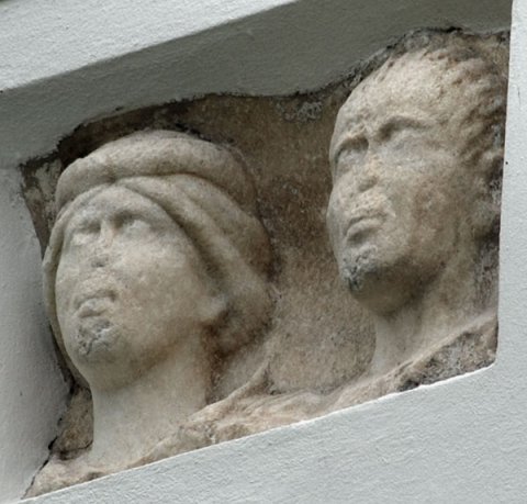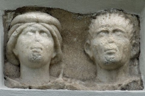 - In Nische mit Doppelbogen (?) zwei Büsten (Brustbilder ?) Ehepaar. Links einheimische Frau: Haube, Fibeln. Rechts Mann: bartlos, gesträhntes Haar.