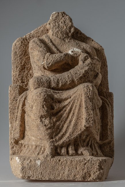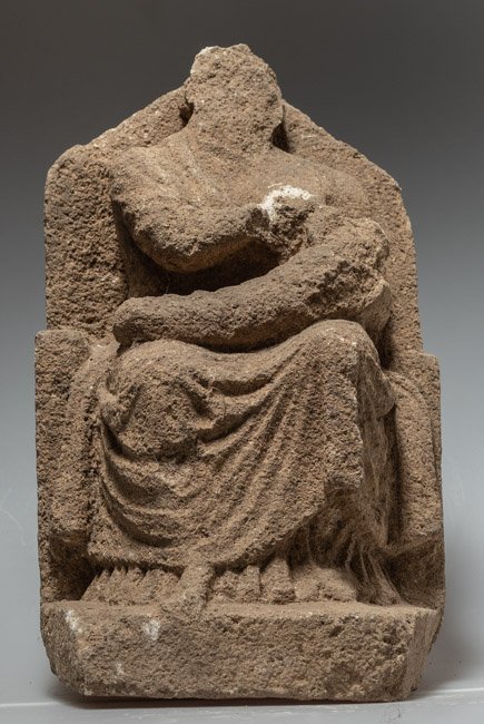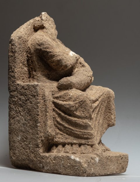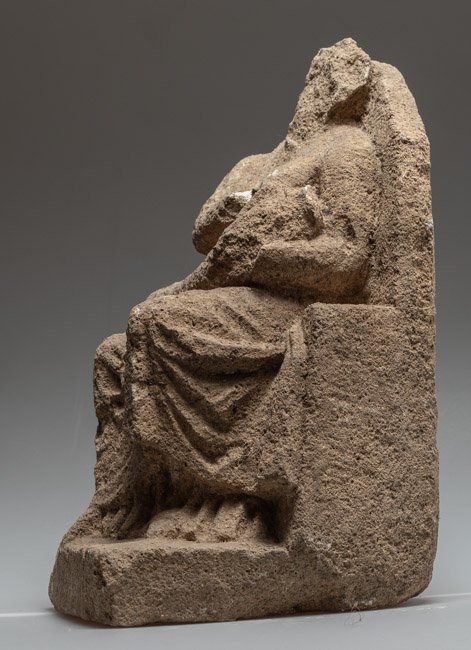 - Mythische Figur: thronende Muttergöttin (Nutrix) in langärmeligem Untergewand und Mantel, die ein auf ihren Knien liegendes Wickelkind säugt.