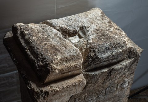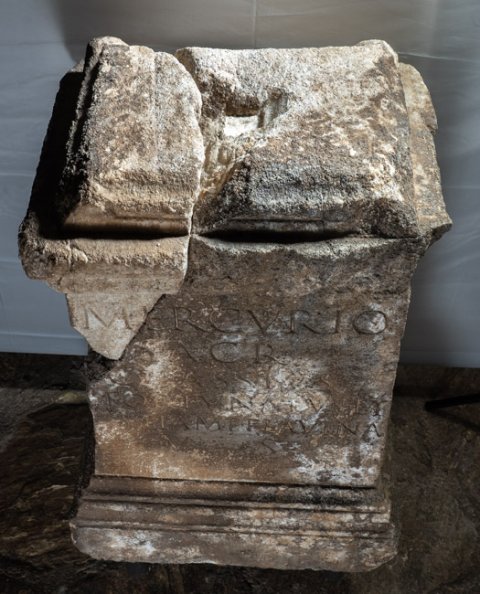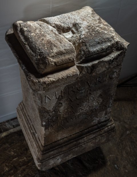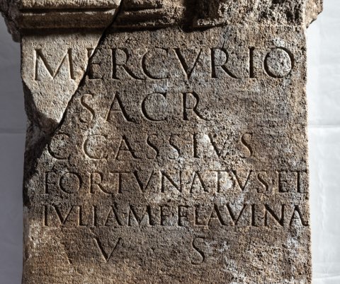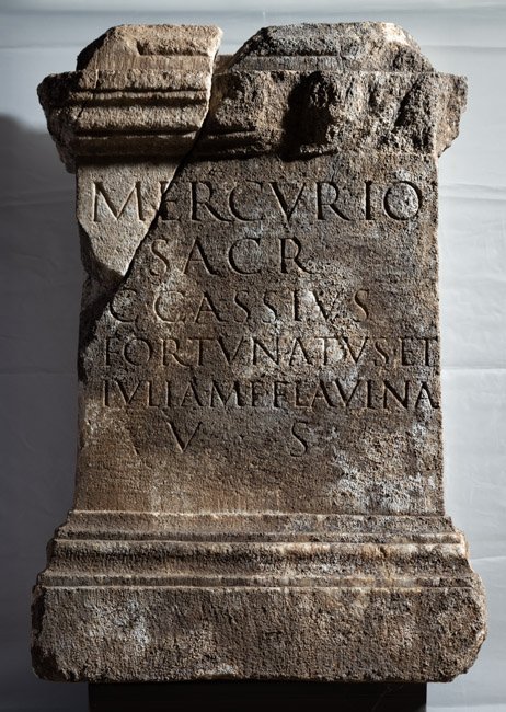 - Mercurio / sacr(um) / C(aius) Cassius / Fortunatus et / Iulia M(arci) f(ilia) Flavina / v(otum) s(olverunt)