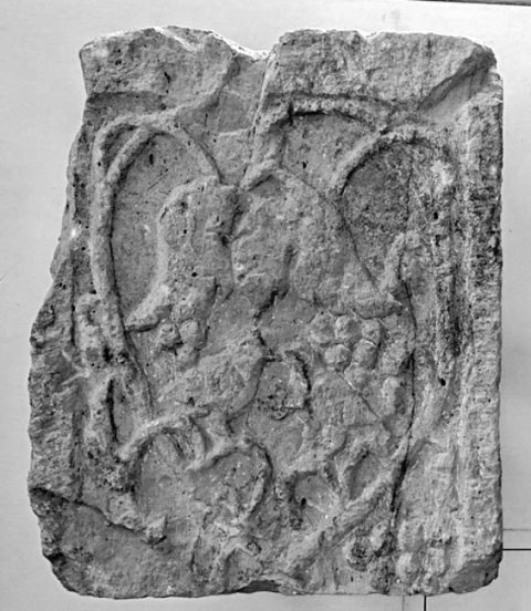 - Einfach gerahmtes Bildfeld, darin Weinranken und Tiere (Vögel)