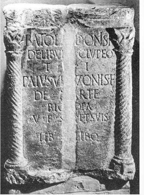 Bato La[e]dionìs f(ilius) / de libur[na] Clupeo / t(estamento) [f]ieri i(ussit) / Paius Ve[r]zonis f(ilius) / de Marte / bic[r]ota / v(ivus) f(ecit) s[ibi] et suis /