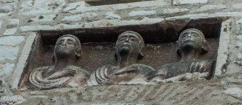 - verwittert, Rahmen verbr., sekundäre Nimben hinter den Köpfen, Gesichter überarbeitet