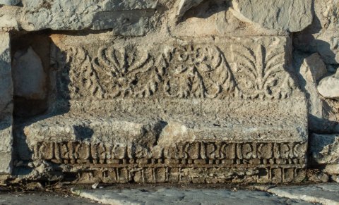 - Gesims mit Pfeifenstab, Astragalstab und Kymation, darüber rechtwinkeliger Rücksprung (bossiert) und Palmettenfries.