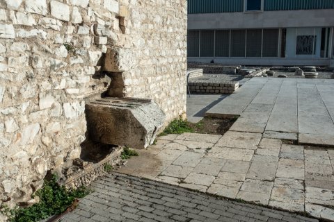 - Architrav mit Fascien, darüber Profilleiste. Auf der Unterseite Soffitte mit Palmette und Ranken (?).