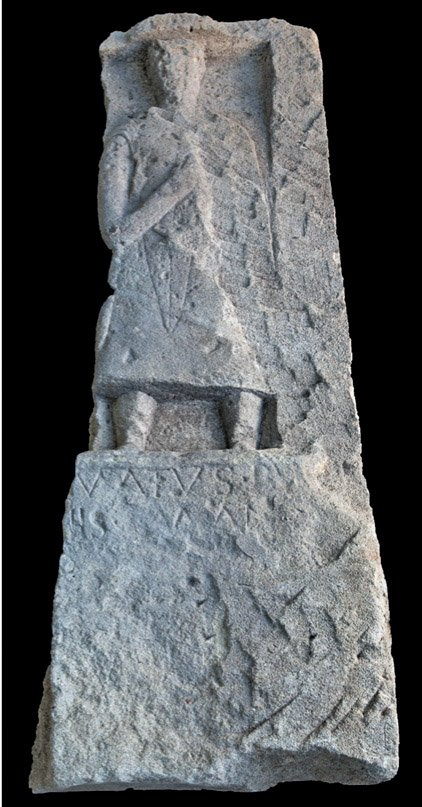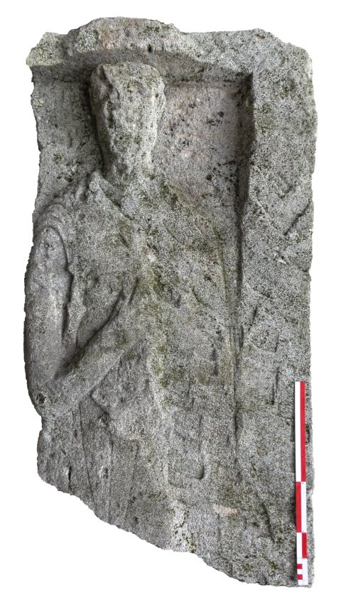 - Stehender Mann in kurzem Untergewand, Mantel (Paenula ?) und Stiefeln, im rechten Arm Schwertscheide mit Schwert.