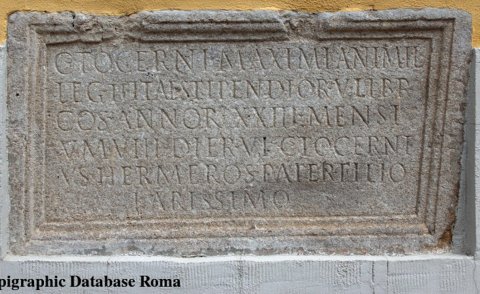 - C(ai) Tocerni Maximiani mil(itis) / leg(ionis) II Ital(icae) stipendior(um) V libr(arii) / co(n)s(ularis) annor(um) XXIII mensi/um VIII dier(um) VI C(aius) Tocerni/us Hermeros pater filio / karissimo