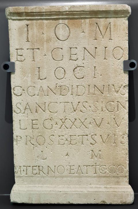 - I(ovi) O(ptimo) M(aximo) / et Genio / loci / C(aius) Candidinius / Sanctus sign(ifer) / leg(ionis) XXX U(lpiae) V(ictricis) / pro se et suis / l(ibens) m(erito) / Materno et Attico co(n)s(ulibus) / [[------]]