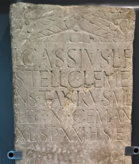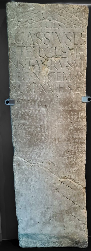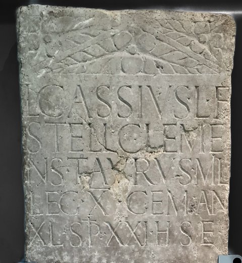 - L(ucius) Cassius L(uci) f(ilius) / Stell(atina) Cleme/ns Taurus mil(es) / leg(ionis) X Gem(inae) an(norum) / XL stip(endiorum) XXI h(ic) s(itus) e(st)