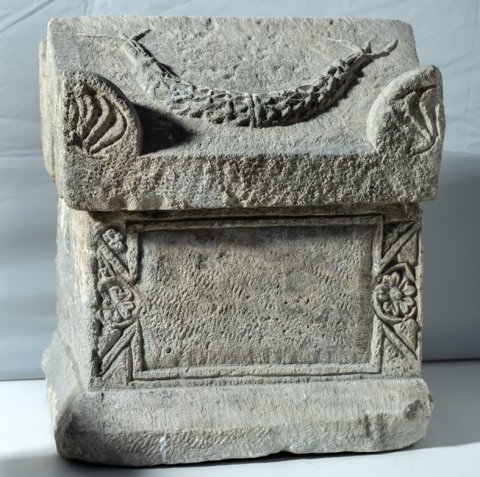 - Dachförmiger Deckel mit Eckakroteren mit Palmetten, auf der vorderen Dachfläche Girlande. Auf dem Kasten leere tabula ansata mit Rosetten und Zwickelblättern in den ansae.