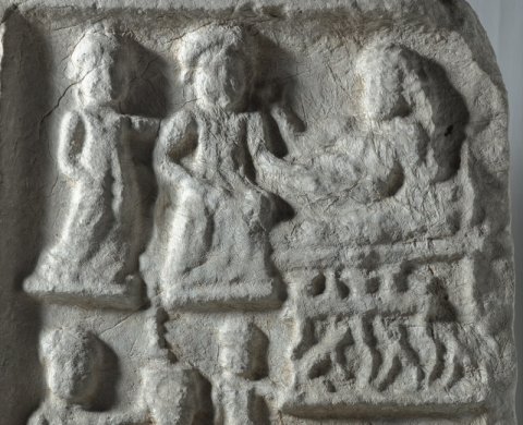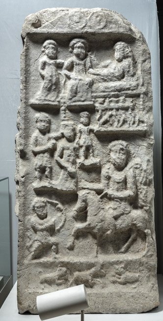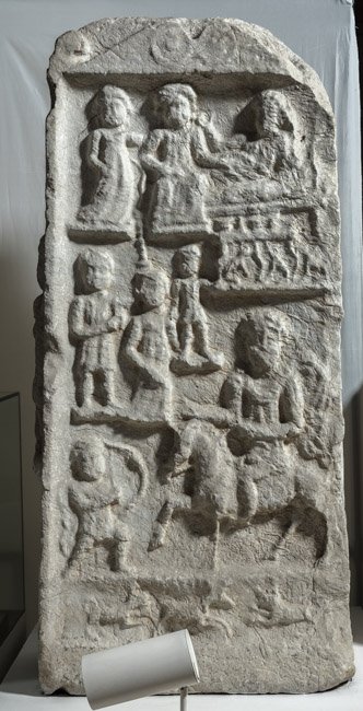 Vorderseite: Giebel, darunter Totenmahl mit Mann auf Kline, vorn Tischchen, auf dem Fußende sitzende Frau, links auf Standleiste stehende Frau. Darunter links auf Standleiste stehender Mann (Knabe ?) und Frau (Mädchen?), rechts oberhalb von ihr kleinere männliche Figur (Kind ?). Unten rechts Reiter nach links, vor ihm kleinerer Bogenschütze. Darunter Tierfries.