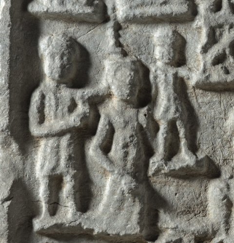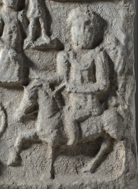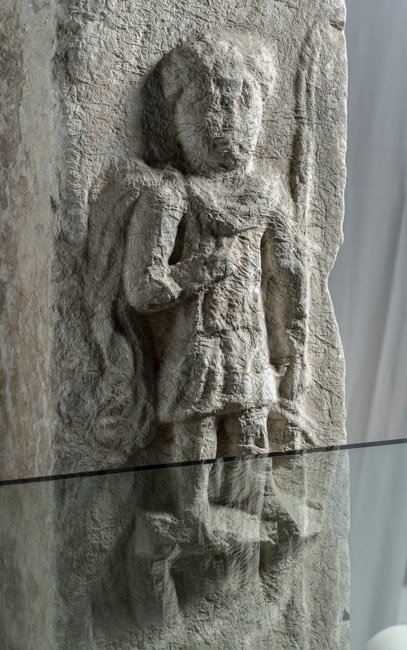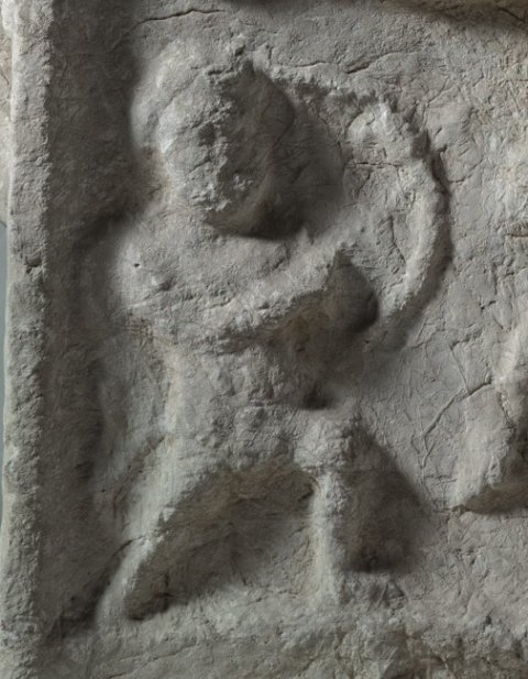Linke Nebenseite: stehender Mann in kurzer Tunica und Schultermantel, im linken Arm Speer.
