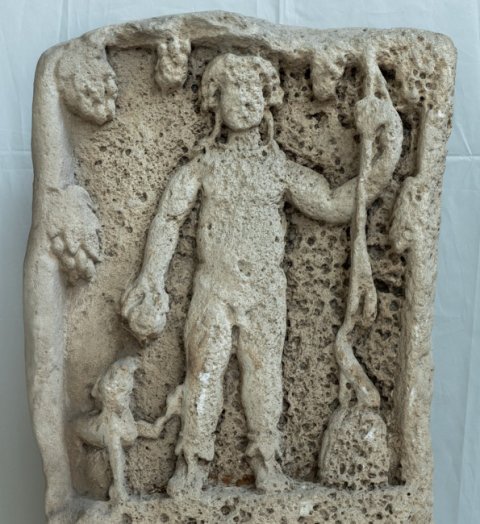 - Mythische Figur: frontal stehender nackter Liber Pater (Dionysos) mit Schulterlocken,kleinem Schultermäntelchen (?) und Stiefeln, in der Rechten Gefäß, in der Linken Stab mit Schlange (?). Neben dem rechten Fuß Panther, entlang der Rahmenleisten Weinranken.