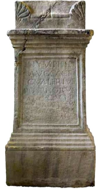 - Nymphis / Aug(ustis) sacr(um) / C(aius) Valerius / P(h)osphorus / aug(ustalis) c(oloniae) U(lpiae) T(raianae) P(oetoviensis) / pro salute sua / et suorum / v(otum) s(olvit) l(ibens) m(erito)