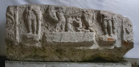 - Mythos: zwischen Rahmenleisten mit Ranken Lupa Capitolina auf rechteckigem Sockel zwischen zwei stehenden Männern (Hirten ?) auf flachen Podesten.