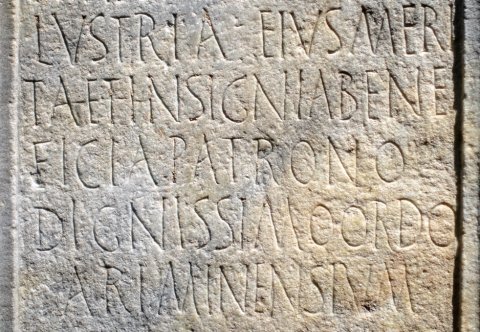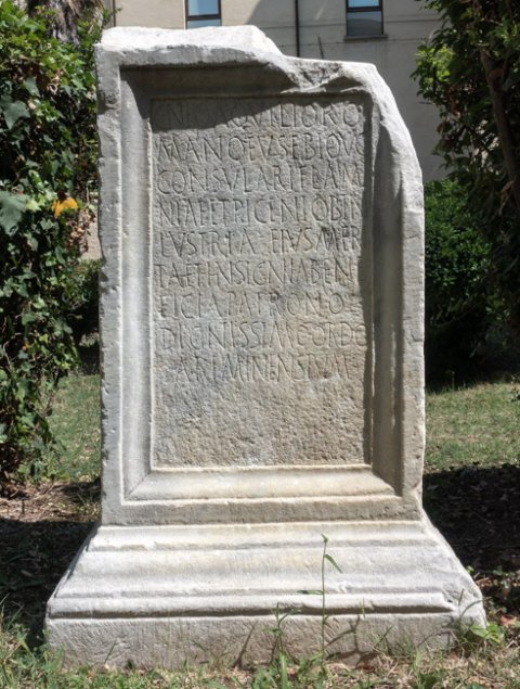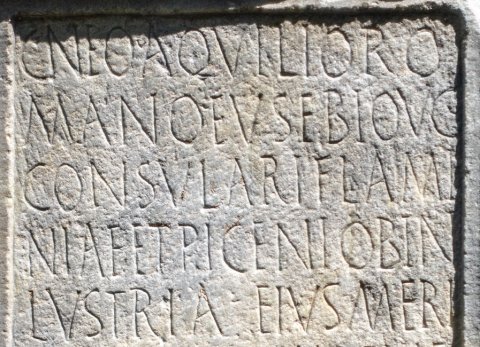 - Cn(a)eo Aquilio Ro/mano Eusebio v(iro) c(larissimo) / consulari Flami/niae et Piceni ob in/lustria eius meri/ta et insignia bene/ficia patrono / dignissimo ordo / Ariminensium