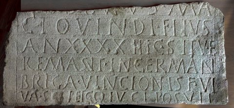 - [---]us Ma/giovinidi fi(l)ius / an(norum) XXXX hic situ(s) e(st) / remasit(!) in German(ia) / Briga Vincionis f(ilia) vi/va s[ib]i et co(n)iugi posuit