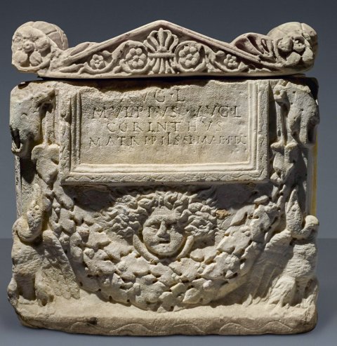 - Dachförmiger Deckel mit geschnürten pulvini an den Seiten, im Giebelfeld Palmette zwischen Blütenranken. Gerahmtes Schriftfeld, seitlich davon Bukranien, an denen eine Eichenlaubgirlande hängt. Im Girlandenbogen Gorgoneion, seitlich der Girlande Schwäne.