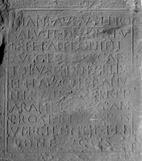 - [D]ian(a)e August(a)e pro / salute d(ominorum) n(ostrorum) Sev/eri et Antonini / Aug(ustorum) et [[Getae]] Caes(aris) / totiusq(ue) d(omus) d(ivinae) L(ucius) Gellius / L(uci) f(ilius) Flavia Celerianus / Nemes |(centurio) leg(ionis) XXII Pr(imigeniae) P(iae) F(idelis) / aram et tabulam / pro se et suis pos/uit Cilone et Li/bone co(n)s(ulibus)