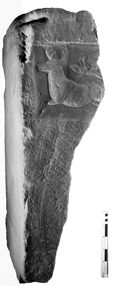 - auf den Nebenseiten oben je ein rechteckiges Bildfeld , links mit Hirschkuh mit Jungem, rechts laufender Hirsch und Baum