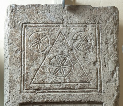 - Stele mit horizontalem Abschluss. Im Bildfeld über der Inschrift eingeritzter Giebel mit Sternrosette, seitlich davon Rosetten. Schriftfeld von kannelierten Pilastern flankiert. Sockelbild mit Fisch (Delphin ?).