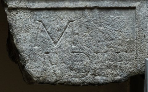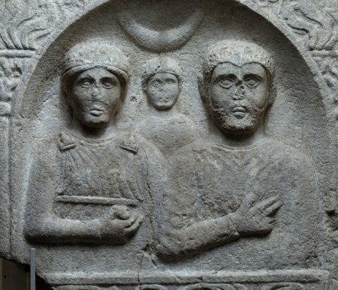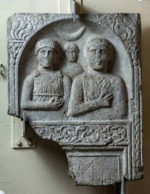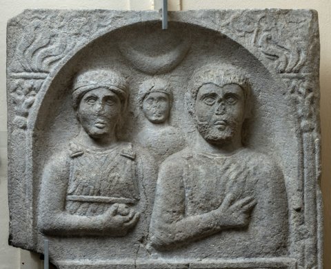 - Bogennische mit Halbfiguren eines Ehepaares (links einheimische Frau mit Haube, Obergewand mit Fibeln und Gürtel, langärmeligem Untergewand, in der rechten Hand Frucht, rechts bärtiger Mann in Ärmelgewand und Sagum). Zwischen beiden Büste eines Kindes (Mädchen ?), über dessen Kopf Girlande (Mondsichel ?). Seitlich der Nische Säulen, darüber Palmetten, unterhalb Rankenfries. Auf den seitlichen Rahmenleisten des Schriftfeldes Blattornament.