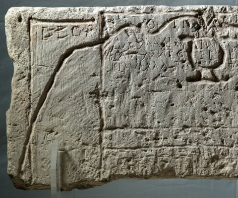 - Eingraviertes Gefäß, aus dem Wasser fließt, geritzter Rahmen, unregelmäig verteilte Ritzinschrift.