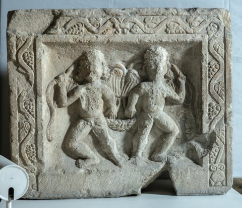 - Auf der Vorderseite (Schmalseite) zwei geflügelte nackte Genien (Eroten), die eine Girlande halten. Auf den Rahmenleisten Weinranken, die aua Gefäßen wachsen.