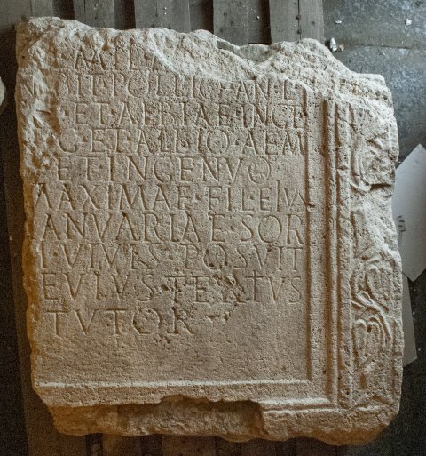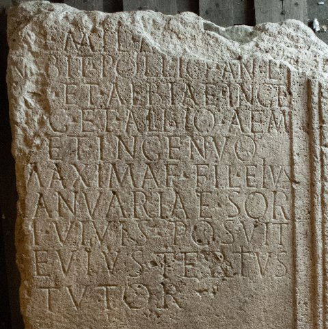 - ---] / [---] Aemil(io) M[---] / [---]n[-]bit(o) Pollio(ni) an(norum) L / [---]T[--] et Albiae Inge(nuae) / [coniu]g(i) et Albio Aem/[iliano] et Ingenuo / [et ---] Maximae fil(iis) eius / [et ---] Ianuariae sor/[or]i vivis posuit / [--- Na]evius Tertius / tutor