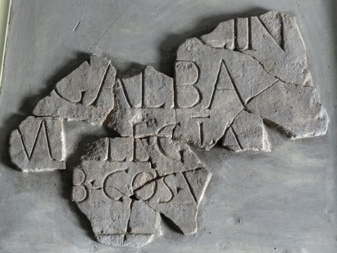 - aus Fragmenten zusammengesetzt, 2 Fragmente vom Anfang der Inschrift nicht anpassend