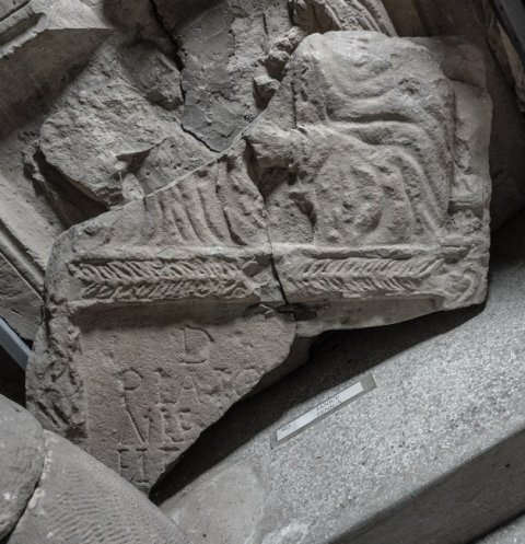 - Zwei Halbfiguren (Ehepaar ?) zwischen Säulen, unterhalb Leiste mit Fischgrät-Ornament.