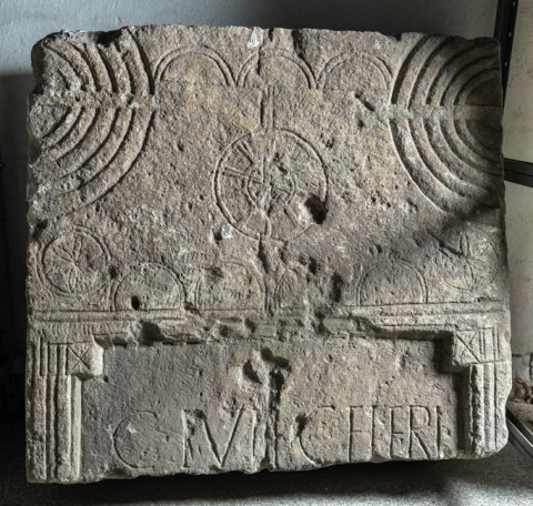 - Stele mit horizontalem Abschluss. Ritzdekor: in den oberen Ecken große konzentrische Halbkreise, dazwischen Reihe von Halbkreisen, in der Mitte Speichenrad, darunter Halbkreise zwischen zwei Kreisrosetten. Inschrift zwischen Plastern.