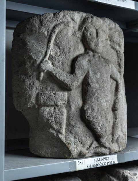 - Mythische Figur: bocksbeiniger Silvanus-Pan mit Pedum und Zweig, neben dem linken Bein Tier, zu seiner Rechten Altar. Das Relief hat die Form einer Halbsäule.