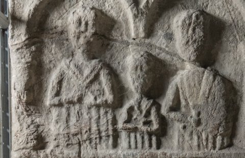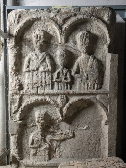- Stele mit zwei Registern. Oben zwei Bögen auf Säulen, darunter Halbfiguren einer Familie aus Ehepaar und Kind (Mädchen ?). Unten zwei Bögen, nur unter dem linken Rest einer Person.
