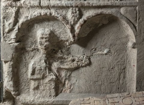 - unten u. rechts abgebr., stark verwittert
