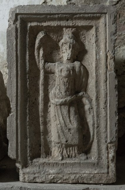 - linke Seite verbr., auf rechter Seite Bosse, Relief verrieben, Sockel u. Bekrönung fehlen
