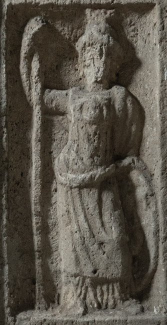 - Auf der Vorderseite stehende Minerva (Athena) mit Aegis, Helm, Lanze und Schild.