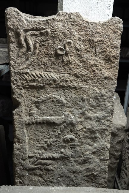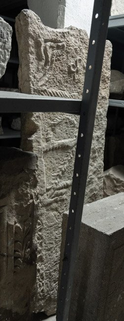 - Reste von Akroteren, Bildfeld mit vierblättriger Blüte zwischen Halbpalmetten, unterhalb Fischgrätband. Darunter Spuren von zwei Bögen, unterhalb davon Giebelfeld mit Rosette (?).