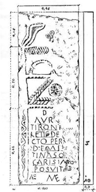 - D(is) [M(anibus)] / Aur[elio] / Tironi [mi]/leti(!) de[fun]/cto per[---] / |(---) D E Val[en]/tina so[cero] / caris(s)imo / posuit b[e]/ne me(renti)