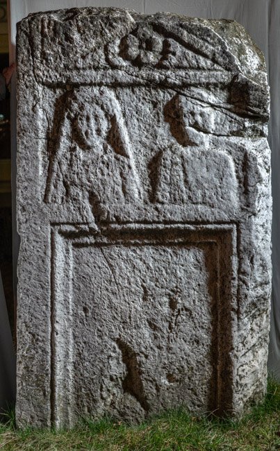- Eingeschriebener Giebel mit Rosette zwischen Blättern. Bildfeld mit zwei Brustbildern (Ehepaar). Links Frau mit Schleier, rechts Mann im Sagum (?).