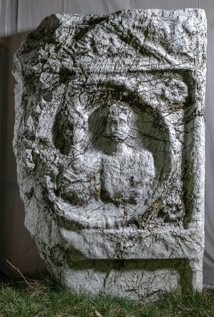 - Eingeschriebener Giebel mit Gorgoneion (?), in den Zwickeln darüber Meerwesen (Hippokamp ?). Bildfeld mit Medaillon, darin zwei Halbfiguren (Ehepaar), in den Eckzwickeln Rosetten, Schriftfeld zwischen Säulen.