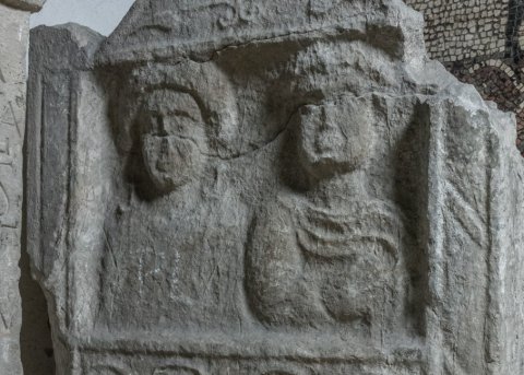 - Giebel mit vegetabilem Ornament. Bildfeld mit zwei Brustbildern (Ehepaar), links einheimische Frau mit Fibeln, rechts bärtiger Mann in Ärmeltunica und Sagum. Darunter Spiralfries. Seitlich pilasterartige Rahmenleisten, unten Ansatz des Schriftfeldes.
