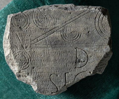 - Ritzzeichnung: Im und über dem Giebel und auf dem seitlichen Rahmen konzentrische Kreise.