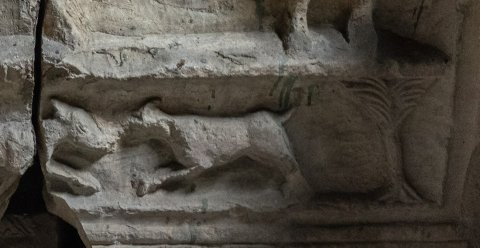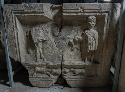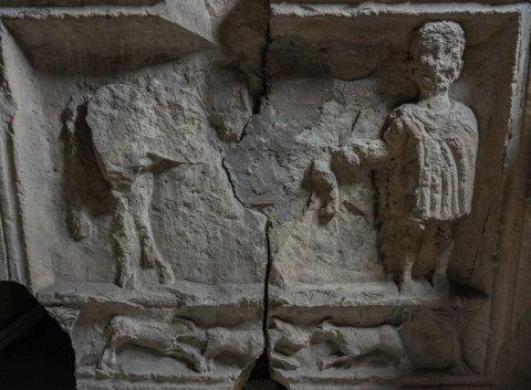 - Relieffeld mit profiliertem Rahmen. Auf schmaler Standleiste Calo im Sagum, hält Pferd am Zügel. Unter der Standleiste Tierfries (zwei Hunde mit einem Hasen, seitlich Bäume).