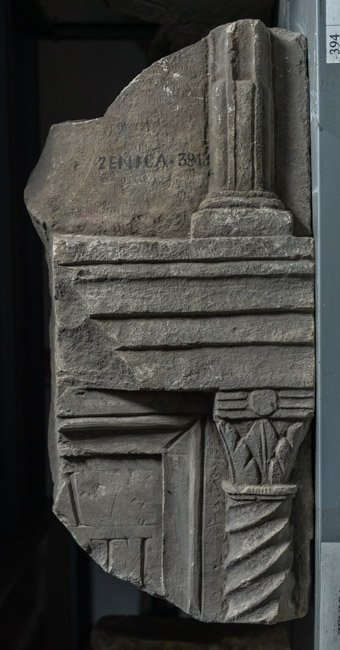 - Oben Rest eines Bildfeldes mit kannelierter Säule, darunter Fascienzone und profiliert gerahmtes Schriftfeld, seitlich Säule mit Spiralkanneluren.