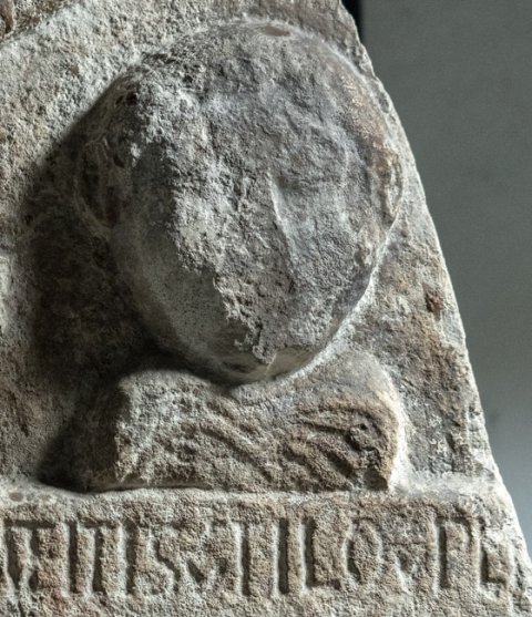 - Dachförmiger Deckel, auf der Oberseite liegende Löwen, im Giebelfeld Büste eines Kindes (Knabe) zwischen Rosetten. Auf der unteren Rahmenleiste Inschrift.