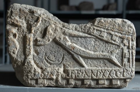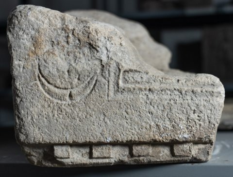 - Dachförmiger Deckel mit Akroteren, im Giebelfeld Aedicula mit Gefäß (Amphore) zwischen Delphinen und Mondsicheln. Auf dem Rahmen Zahnschnitt. Auf den Längsseiten schmales gerahmtes, eingetieftes Feld zwischen Mondsicheln, am unteren Rand Zahnschnitt.