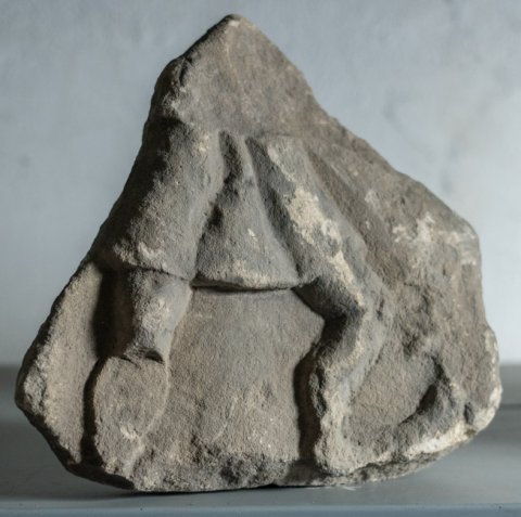 - Mythische Figur: Unterteil der nach rechts laufenden Diana in kurzem Gewand, rechts unten Rest eines Tieres.