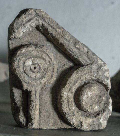 - Gerahmter Giebel, unter der Giebelspitze Griffschlae (patera) ?, im rechten Eck Volute (?).