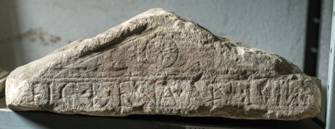 - Dachförmiger Deckel, in der Giebelspitze Rosette (Ritzzeichnung), darunter Inschrift.
